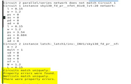 The parameter mismatch messages come from 1) parameter naming differences and 2) the finger differences between xschem and magic. For example, magic uses ‘l’ for the MOSFET channel length whereas xschem uses ‘L’. Netgen cannot catch that they are actually equivalent. For fingered transistors, xschem uses m=2 (or nf = 2), whereas magic prints parameters of each finger of MOSFETs. As a result, these two circuits are identical even though Netgen throws the parameter errors. Even when there are serious parameter mismatches, you can catch them by reading the log.